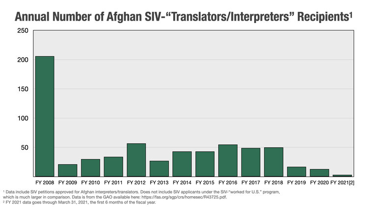 Important note: at this point, neither of these programs are likely to be responsive enough to the rapidly unfolding situation on the ground in Afghanistan to be of any use now. It appears that the most timely legal pathways will be parole, asylum, Temporary Protected Status (TPS), or some other option. It is nonetheless useful to look back at the number of SIVs issued over the past nearly decade and a half.